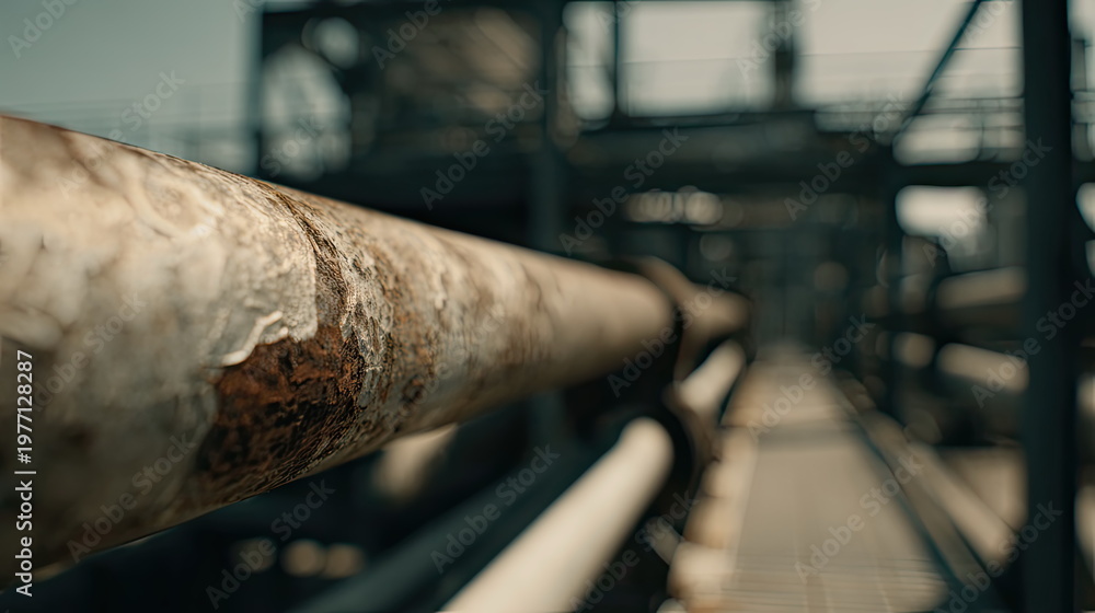 Rusted metal pipe showing peeling paint and corrosion with a blurred industrial facility in the background, conveying themes of neglect and aging infrastructure #1977128287