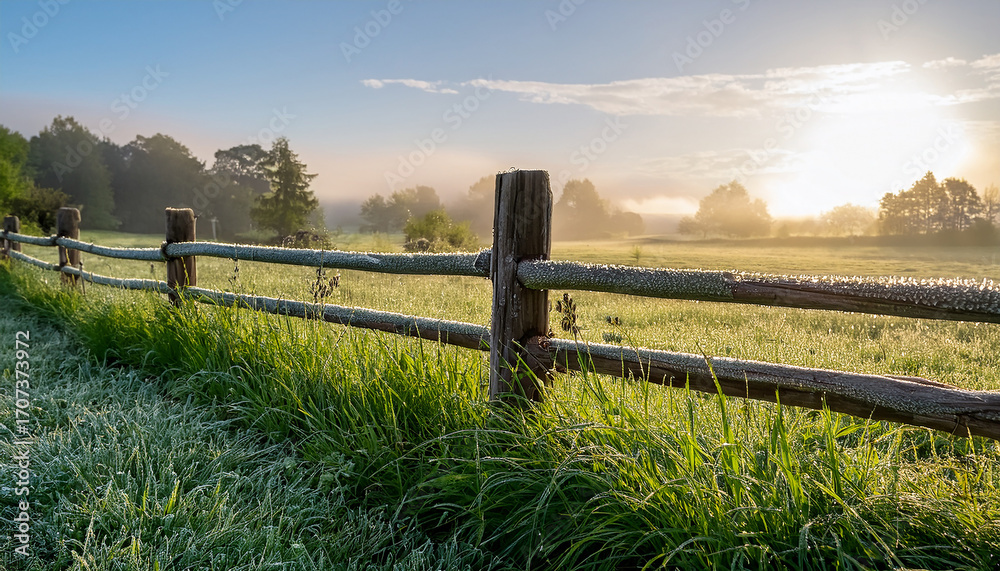Rustic Wooden Fence in a Misty Meadow at Sunrise with Dew Drops Keywords: fence, wooden, rustic, rural, countryside #1707373972