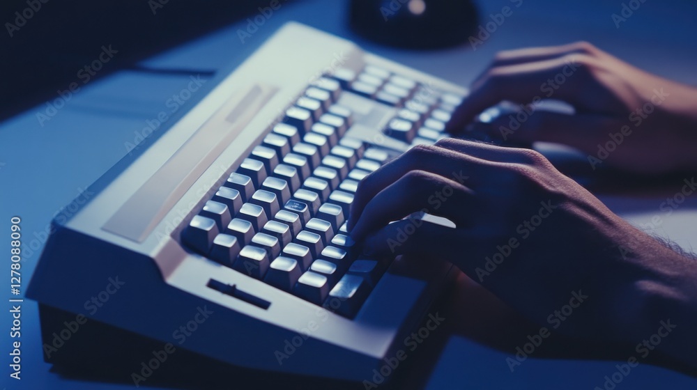 90s style keyboard man typing, in the style of a drab 80s training video #1278088090