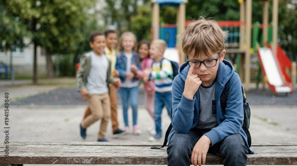 Sad lonely boy sitting on playground bench while peers laugh in background. Social isolation and bullying concept. Child feeling excluded at school park #1941549840