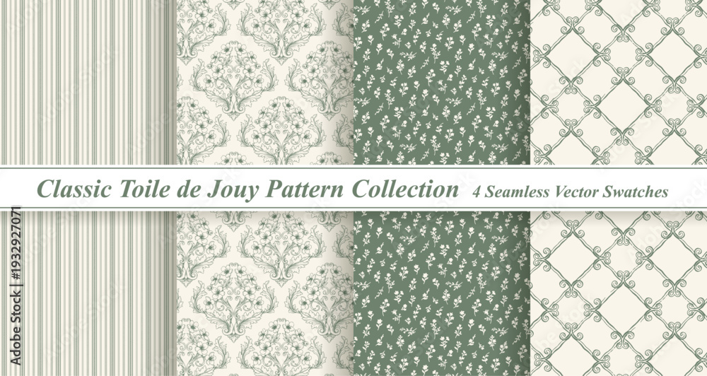 Sage Green Toile de Jouy Pattern Set - Vintage Botanical & Cottagecore Backgrounds #1932927071