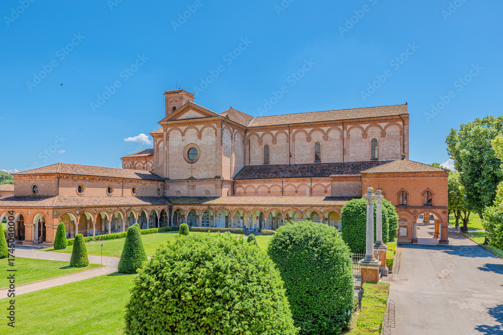Saint Christopher Church in Charterhouse of Ferrara features a stunning Renaissance porch with elegant arches and columns, alongside a tall bell tower under a clear blue sky in Ferrara city of Italy #1745040004