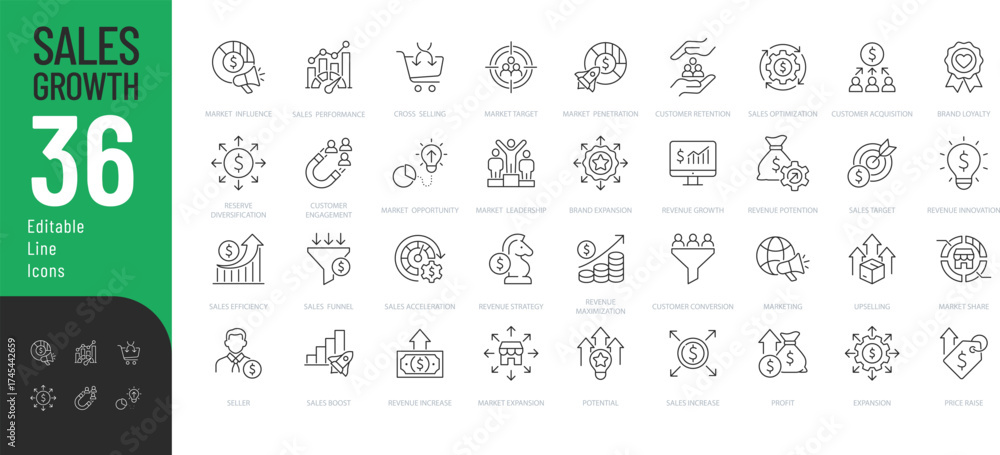 Sale Growth Line Editable Icons set. Vector illustration in modern thin line style of marketing related icons: profit, revenue, strategy, and more. Isolated on background #1745442659