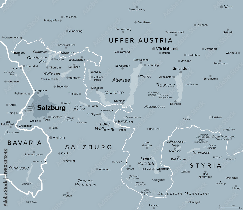 Salzkammergut region, a resort area in Austria, Europe, gray political map. Stretching from city of Salzburg eastwards to Dachstein Mountains, featuring iconic Sound of Music filming locations. Vector #1980834843