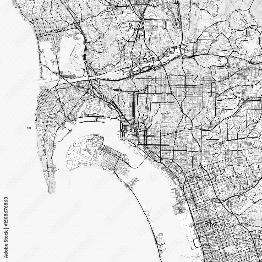 San Diego Area Map with Labels and Neighborhoods - One color, minimalistic design #1508676860