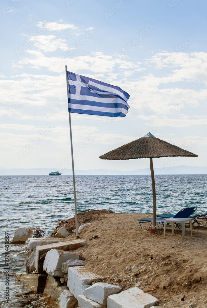Sandy beach in Greece with straw umbrellas and lounge chairs near the calm sea, framed by a fluttering Greek flag #1974480557