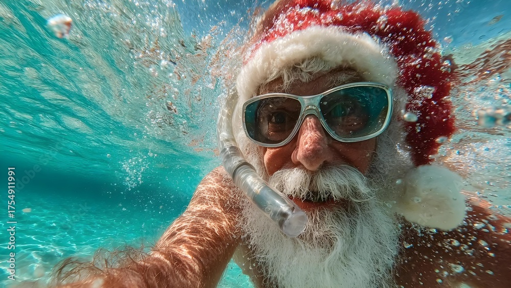 Santa Claus snorkeling underwater in turquoise blue water with a snorkel and sunglasses. Concept Santa Claus snorkeling underwater, Turquoise blue water, Snorkel and sunglasses #1754911991