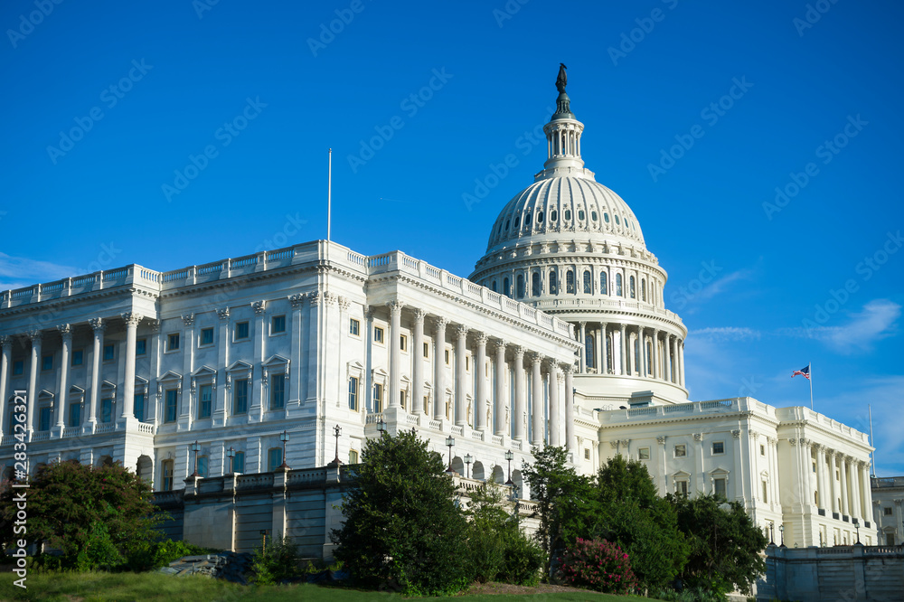 Scenic blue sky view of the US Capitol Building in bright afternoon sun in Washington DC, USA #283426321