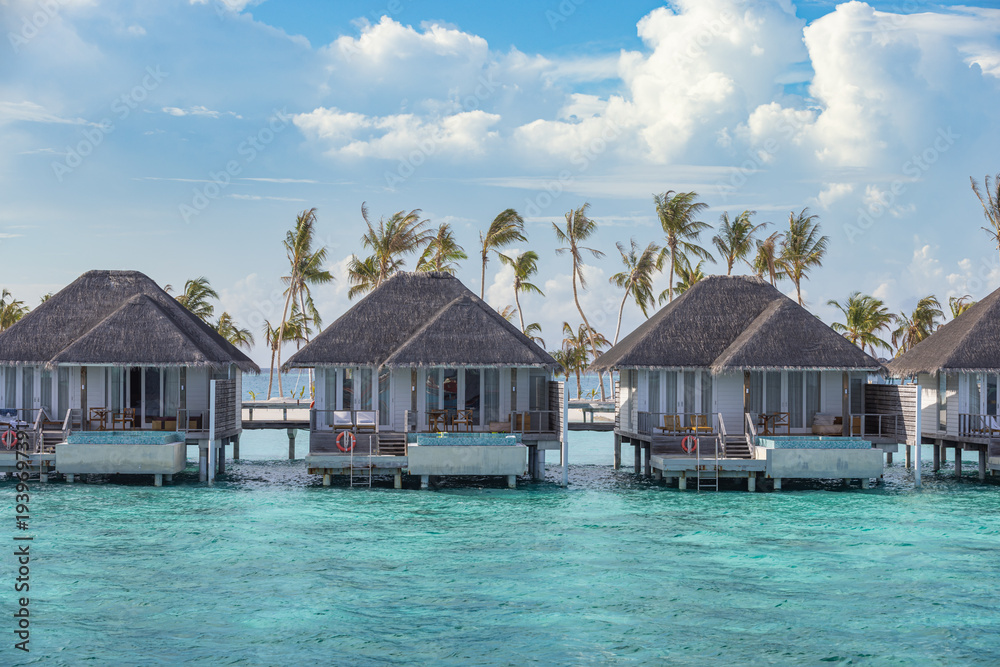 Scenic Maldives overwater villas above calm turquoise ocean lagoon tropical luxury island resort with serene seascape horizon exotic summer travel destination, relax outdoors. Hotel coast #1939697391