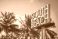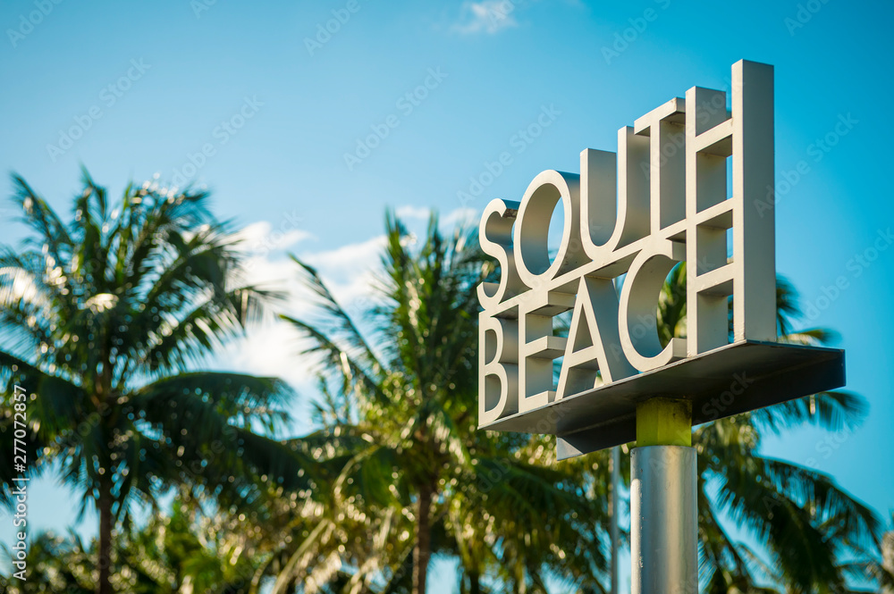 Scenic sunlit view of the entrance to South Beach sign with a tropical palm tree in Miami, Florida, USA #277072857