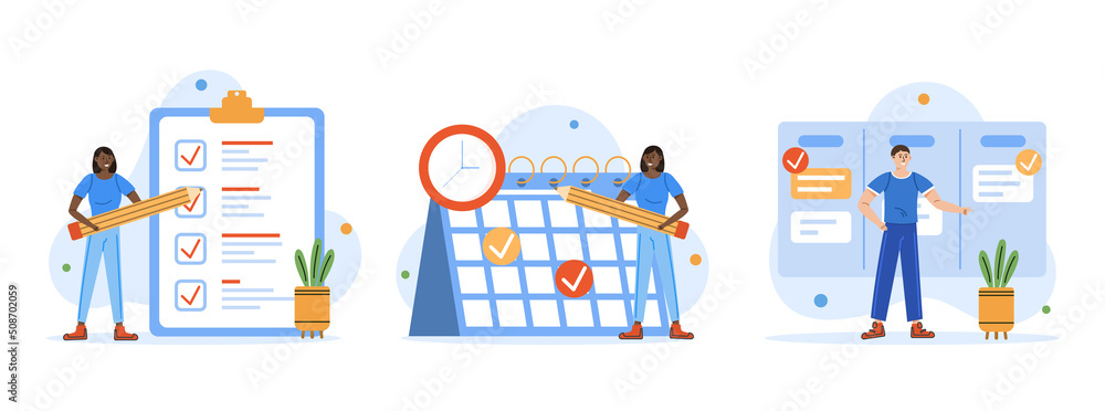 Schedule planning illustration set. Characters planning work tasks with pencil, filling check list, making schedule using board. Business and organization concept. Vector illustration #508702059