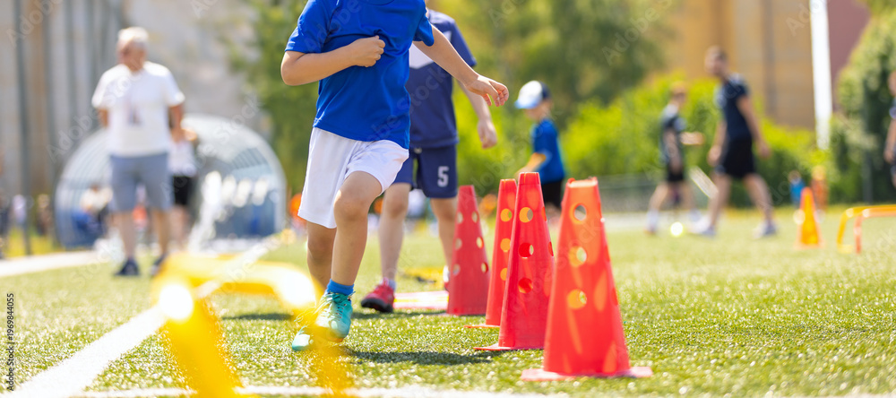 School Sports Class For Kids. Youth Soccer Agility Training. Kids Running Through Cones During Football Practice on Grass Field #1969844055