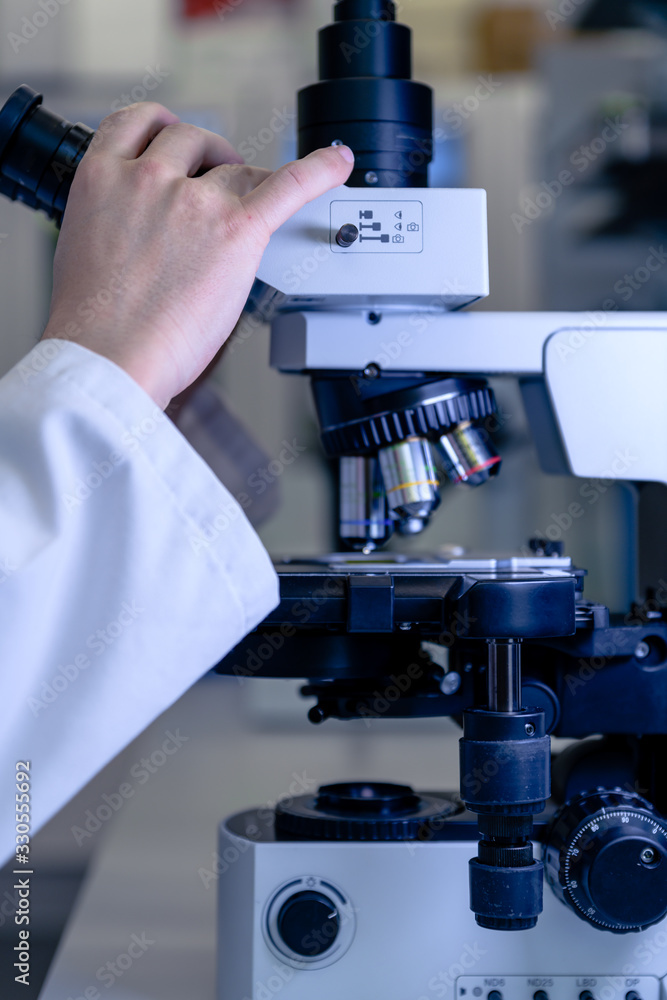 Scientific handling a light microscope examines a laboratory sample for pharmaceutical bioscience research. Concept of science, laboratory and study of diseases. #330555692