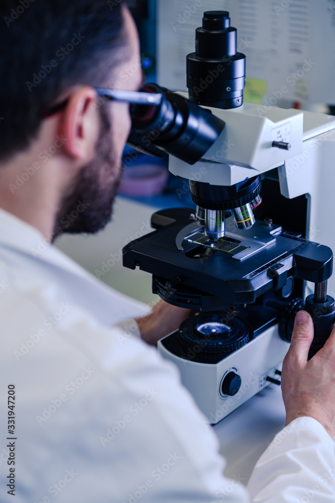 Scientific handling a light microscope examines a laboratory sample for pharmaceutical bioscience research. Concept of science, laboratory and study of diseases. Coronavirus (COVID-19) treatment. #331947200