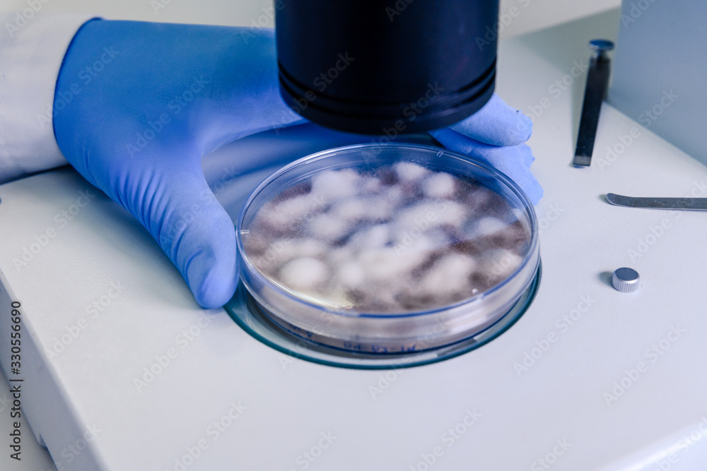 Scientific handling a light stereomicroscope examines a culture in a petri dish for pharmaceutical bioscience research. Concept of science, laboratory and study of diseases. #330556690