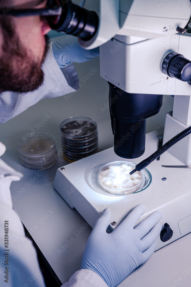 Scientific handling a light stereomicroscope examines a culture in a petri dish for pharmaceutical bioscience research. Concept of science, laboratory and study of diseases. Coronavirus (COVID-19) #331948731