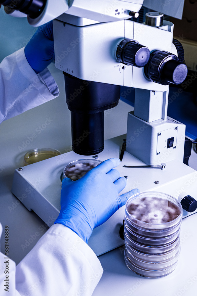 Scientific handling a light stereomicroscope examines a culture in a petri dish for pharmaceutical bioscience research. Concept of science, laboratory and study of diseases. Coronavirus (COVID-19) #331948889