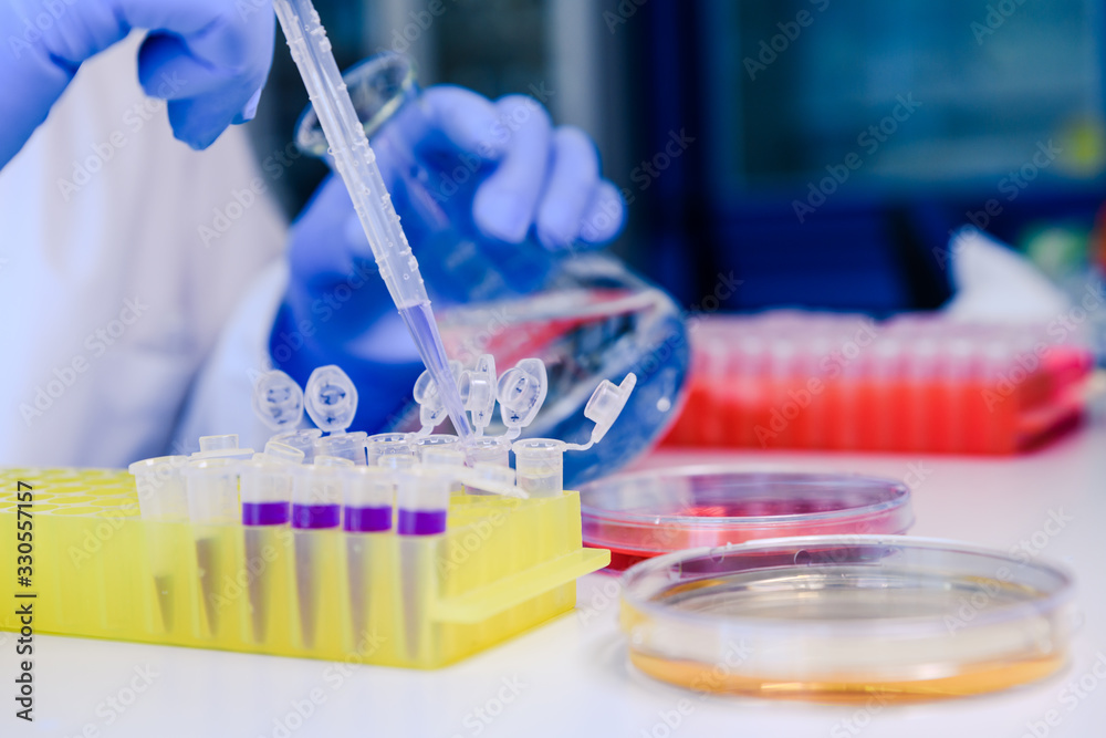 Scientist working with a pipette and a flask, in plastic tubes for DNA studies. Concept of science, laboratory and study of diseases. #330557157
