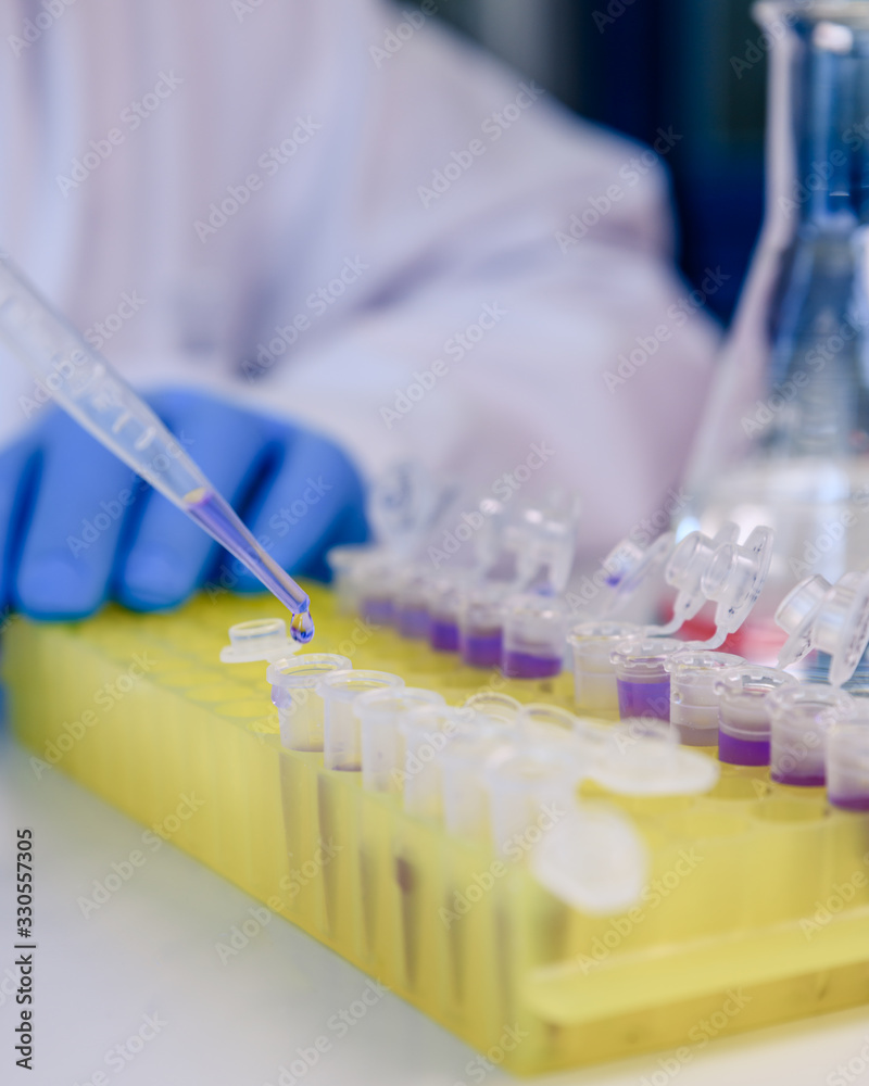Scientist working with a pipette and a flask, in plastic tubes for DNA studies. Concept of science, laboratory and study of diseases. #330557305