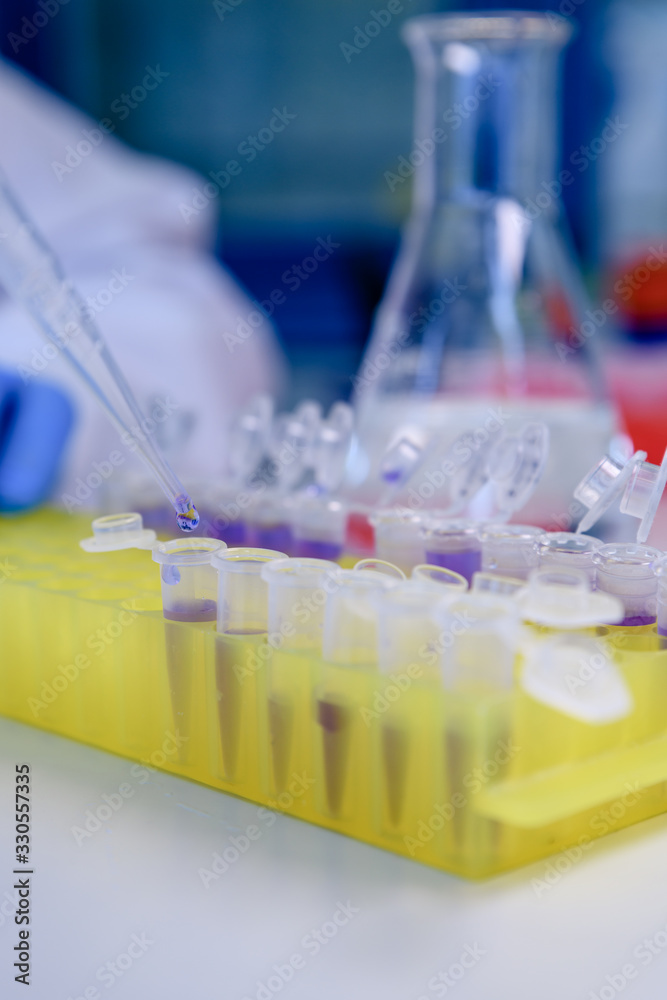 Scientist working with a pipette and a flask, in plastic tubes for DNA studies. Concept of science, laboratory and study of diseases. #330557335