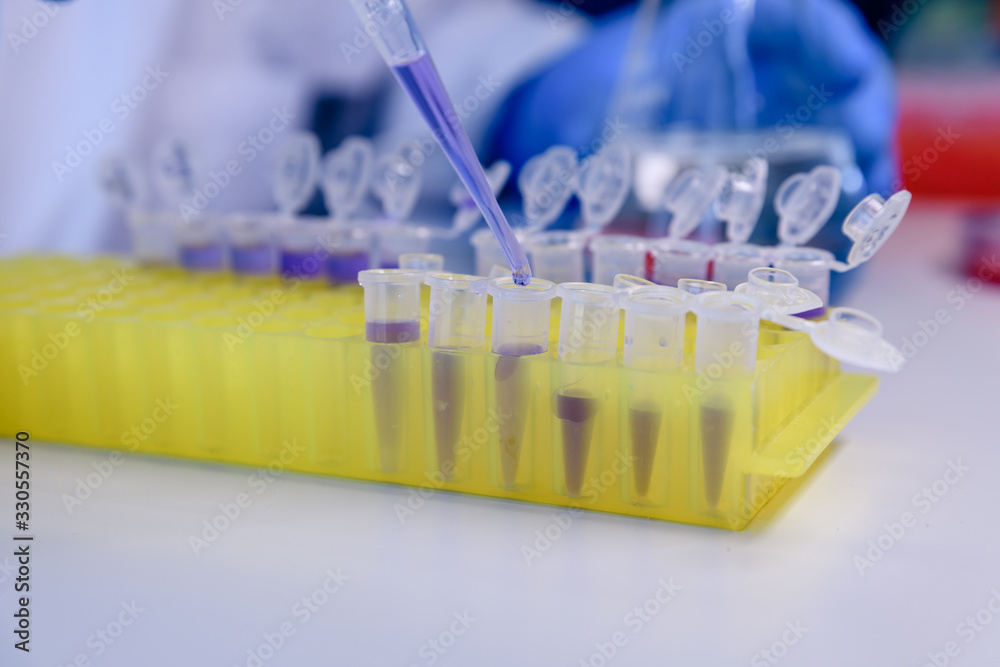 Scientist working with a pipette and a flask, in plastic tubes for DNA studies. Concept of science, laboratory and study of diseases. #330557370