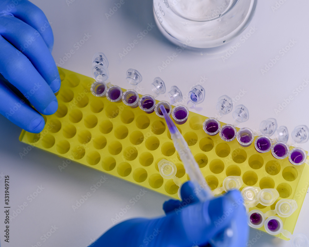Scientist working with a pipette and a flask, in plastic tubes for DNA studies. Concept of science, laboratory and study of diseases. Coronavirus (COVID-19) treatment developing. #331949715