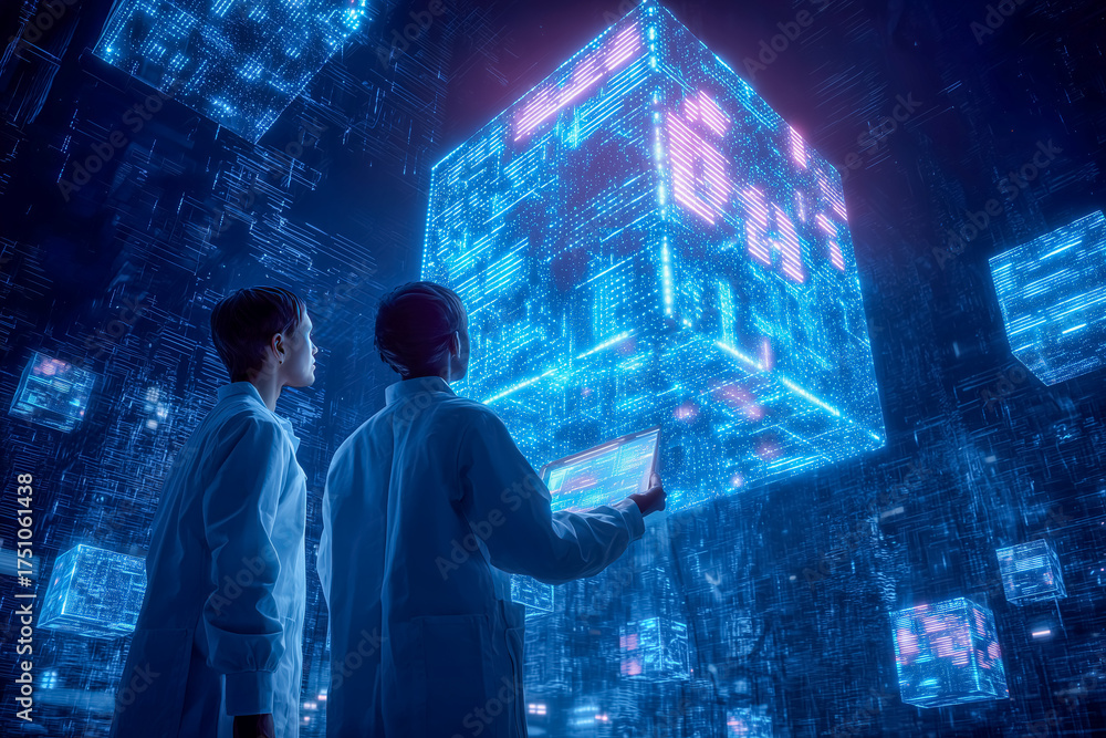 Scientists observe floating data cubes in a futuristic digital environment during a technology presentation at night #1751061438