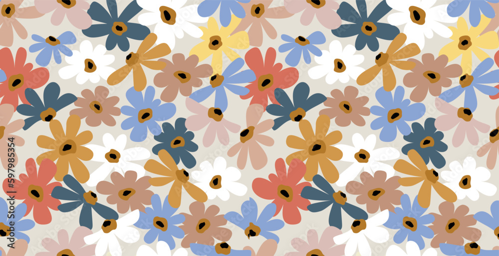 Seamless background with primitive childish floral pattern. Simple minimalistic background, cute big light flowers in boho style. Children's wallpaper, print for textile, cover #597985354