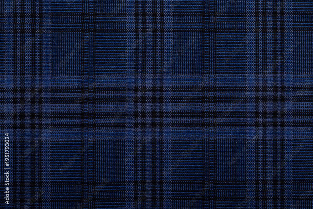Seamless blue plaid textile pattern with intersecting dark lines, ideal for backgrounds, fashion, textiles, and design projects. #1951793024