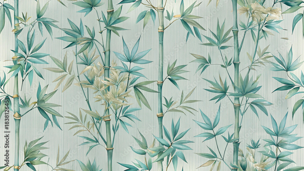 Seamless illustration of bamboo forest with stalks and leaves in shades of teal and mint green #1838126451