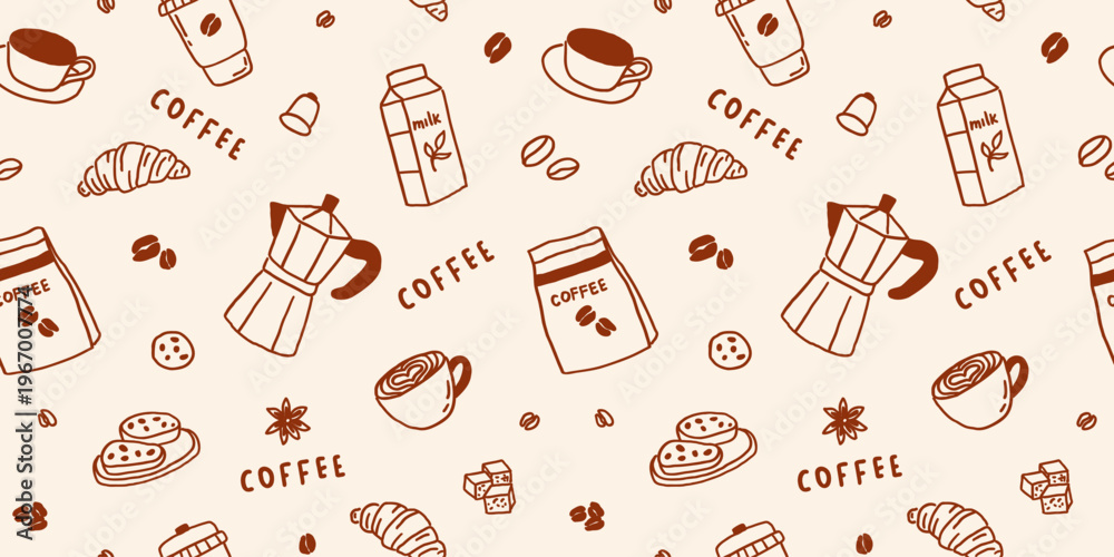 Seamless pattern coffee line art. Bean coffee cup whimsical background. Abstract shop menu texture banner. Vector illustration #1967007774