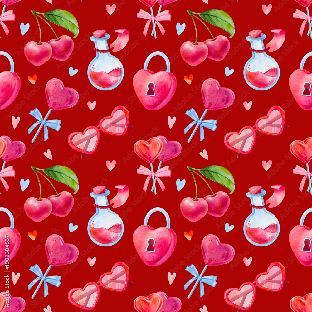 Seamless pattern for Valentines day, cherry, heart shaped candy, heart shaped lock, a cute hand drawn watercolor illustration for Valentine's Day on a bright red background. #1902384537