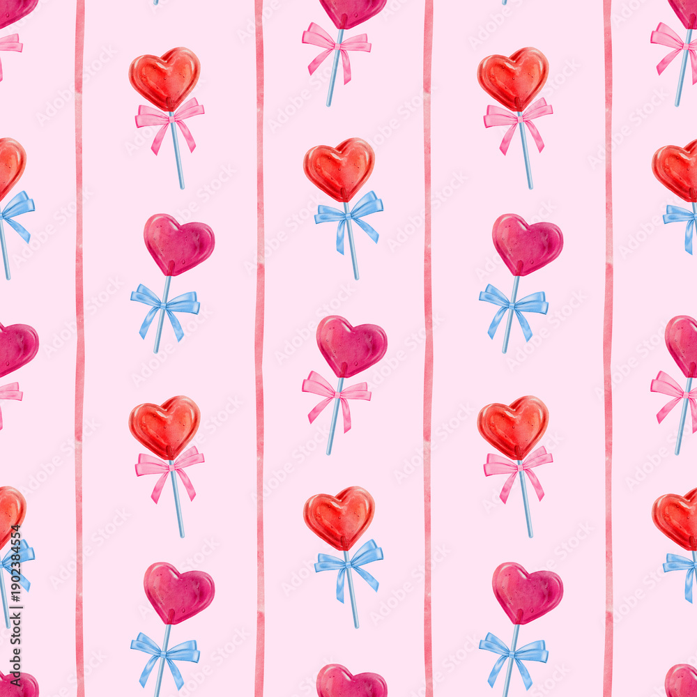 Seamless pattern for Valentines day, heart shaped candy, lollypop in a shape of a heart, a cute hand drawn watercolor illustration for Valentine's Day on a light pink background. #1902384554