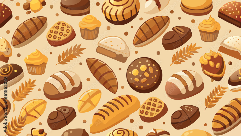 Seamless pattern of cartoon breads pastries and wheat ears on beige background pastry #1661862082