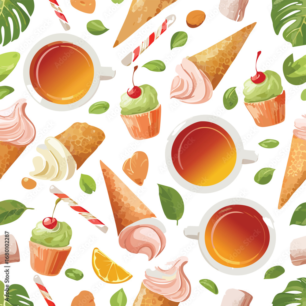 Seamless pattern of ice cream cones cupcakes tea cups and candy cherry #1680102287