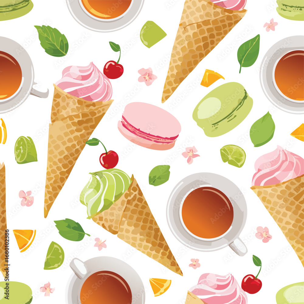 Seamless pattern of ice cream cones macarons and cups of tea with fruit tea cup cherry #1680102386