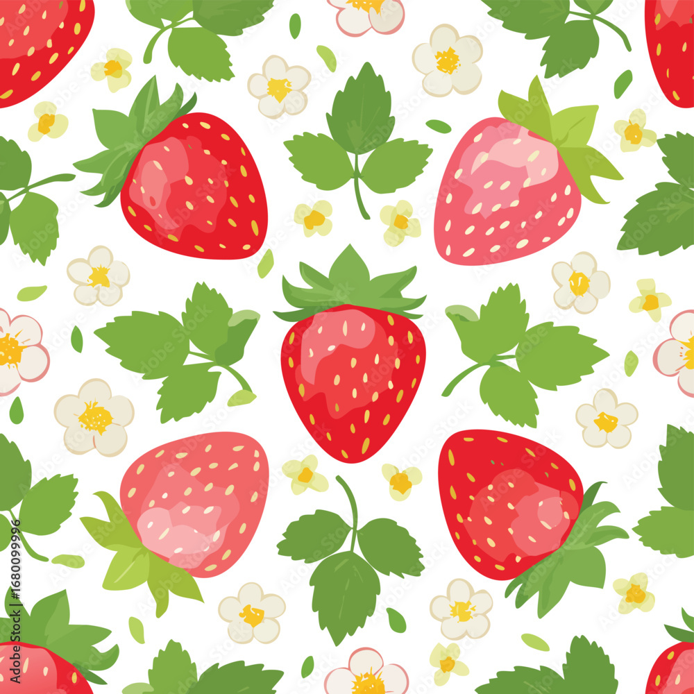 Seamless pattern of red strawberries green leaves and white flowers strawberry fruit #1680099996