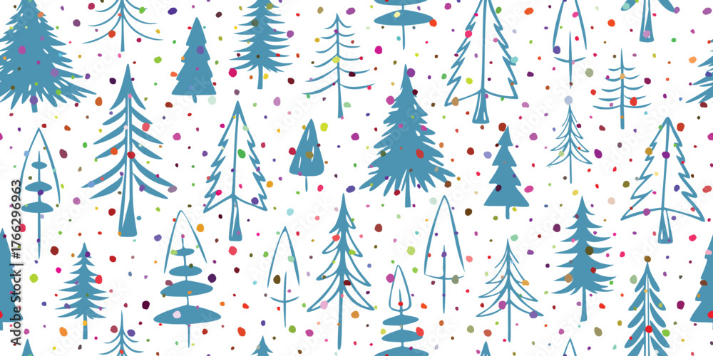Seamless pattern of trees and confetti, winter holiday background, Christmas and New Year, vector design #1766296963