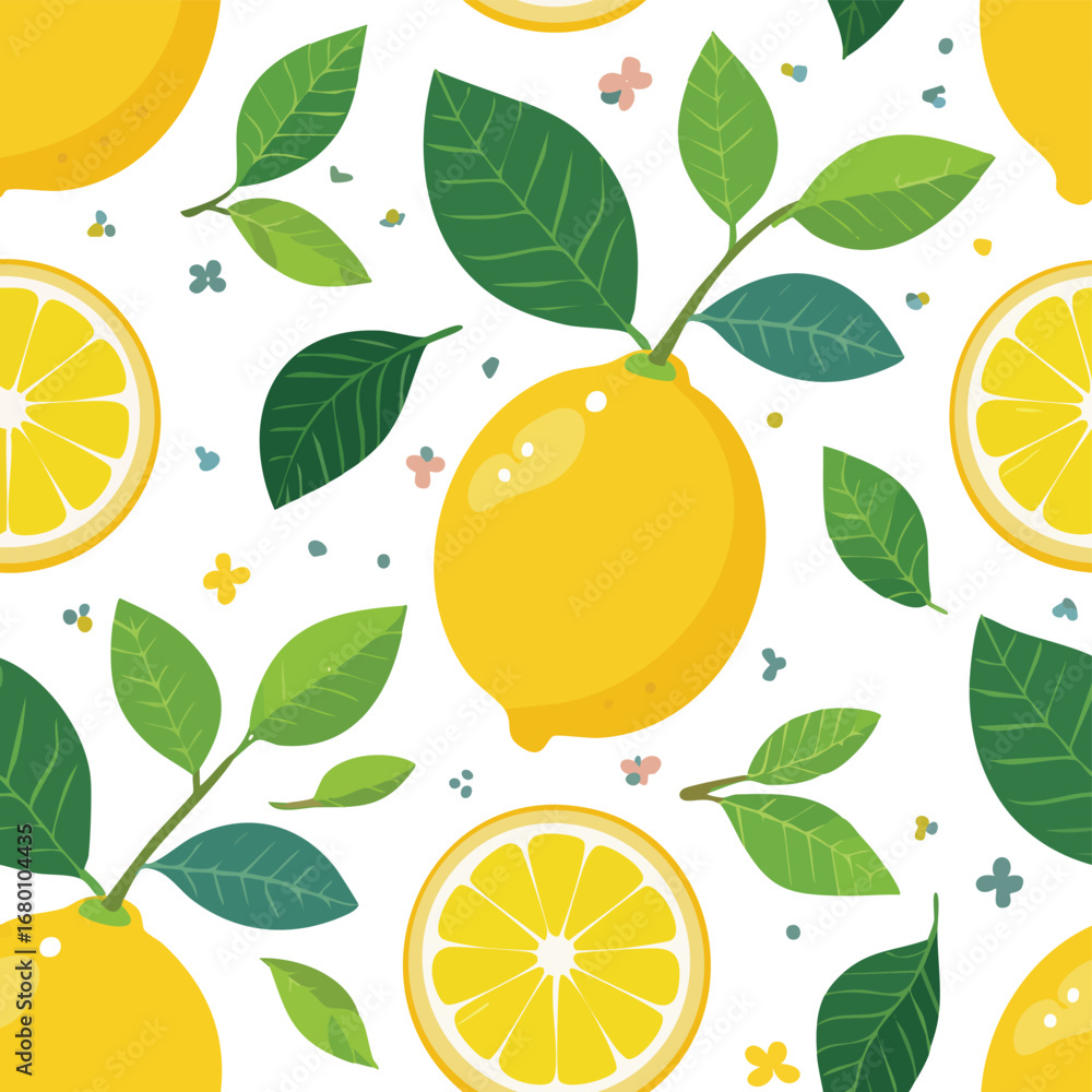 Seamless pattern of yellow lemons and green leaves with small flowers citrus fruit #1680104435