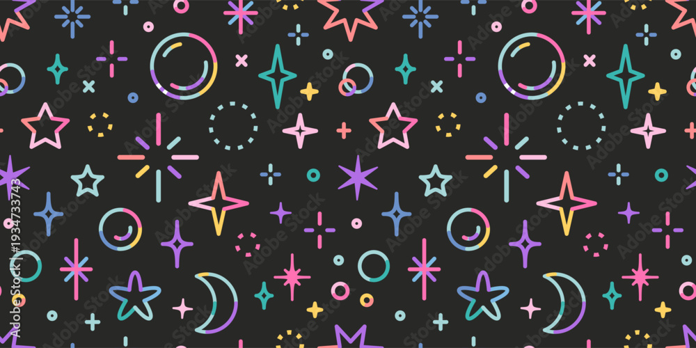 Seamless pattern with neon star, sparkle and soap bubbles in bright colors. Decorative elements for festive and magical design. Trendy modern vector illustration on black background #1934733743