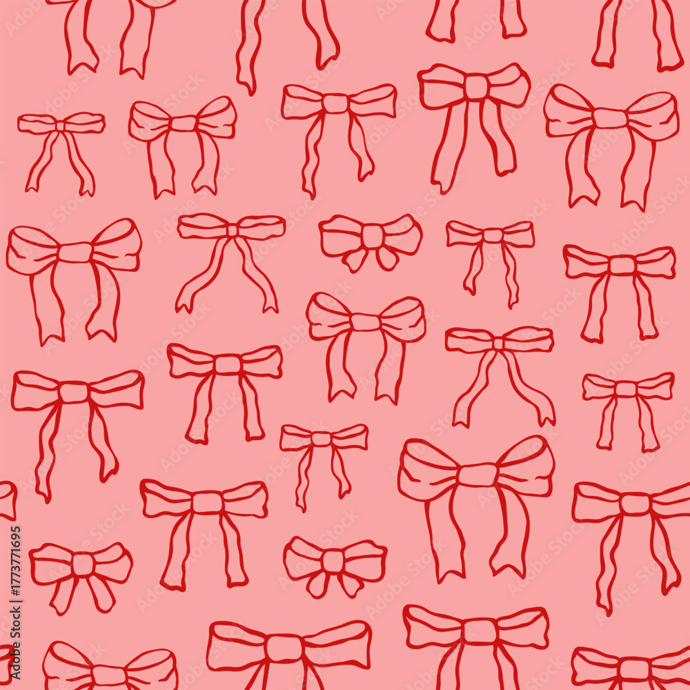 Seamless pattern with tied bows. Hand drawn present knots, feminine accessorizes. Christmas, birthday gifts background. Doodle coquette elements. Romantic vector illustration. Pretty retro art. #1773771695