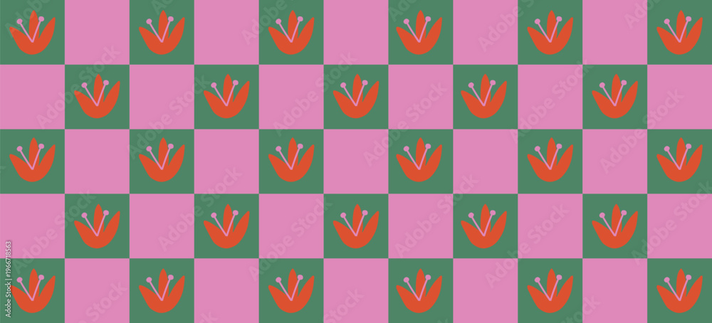 Seamless Retro Checkered Floral Pattern – Whimsical Hand Drawn Dopamine Design for Joyful Branding #1966718563