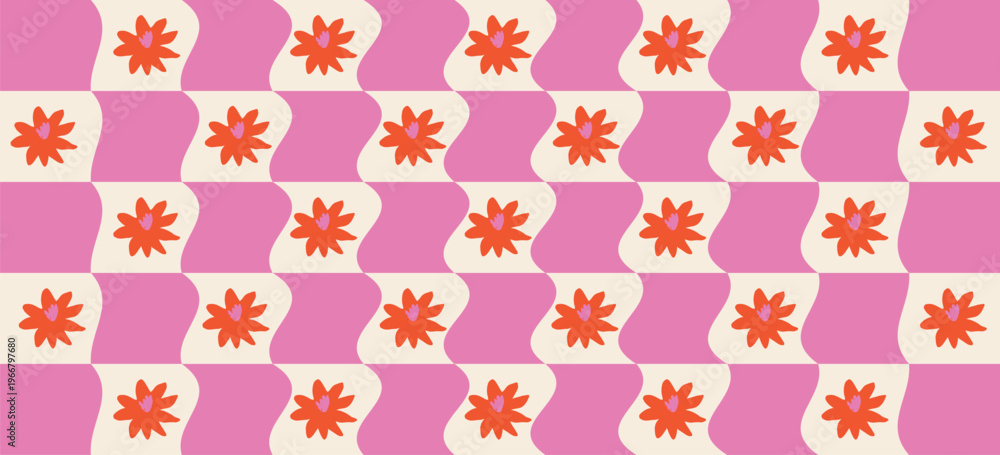 Seamless Retro Checkered Floral Pattern – Whimsical Hand Drawn Dopamine Design for Joyful Branding #1966797680