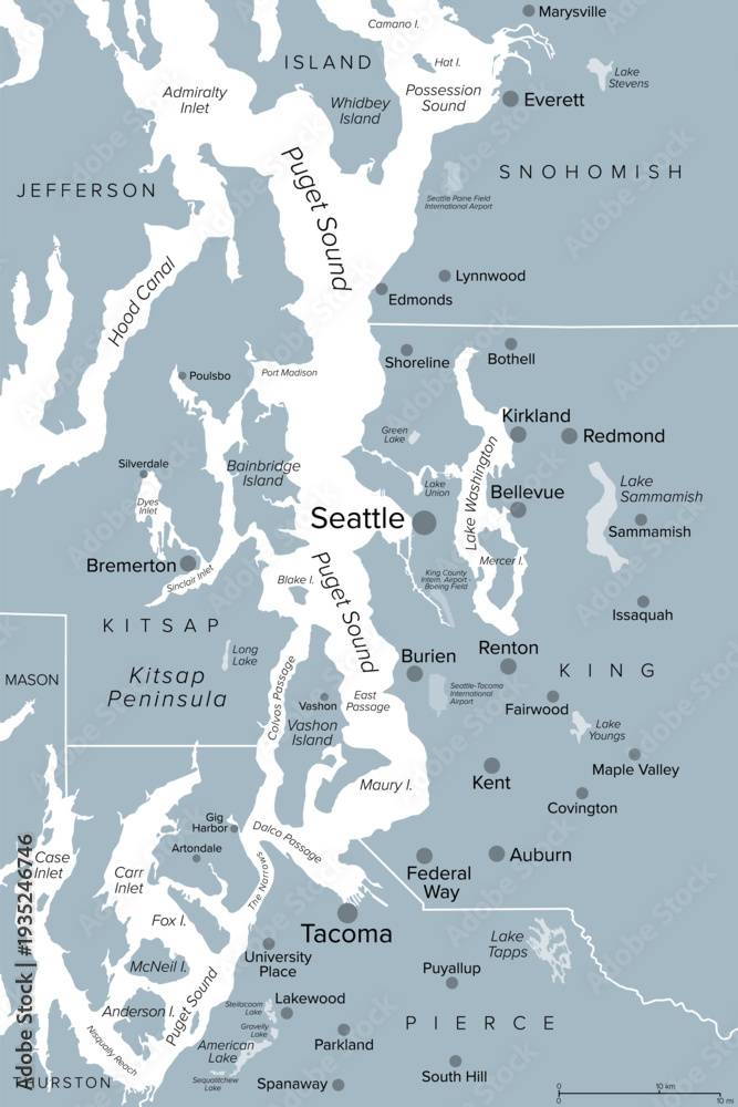 Seattle metropolitan area, U.S. state of Washington, gray political map. Urban agglomeration comprising Seattle, its surrounding satellites and suburbs, in counties King, Pierce, and Snohomish. Vector #1935246746
