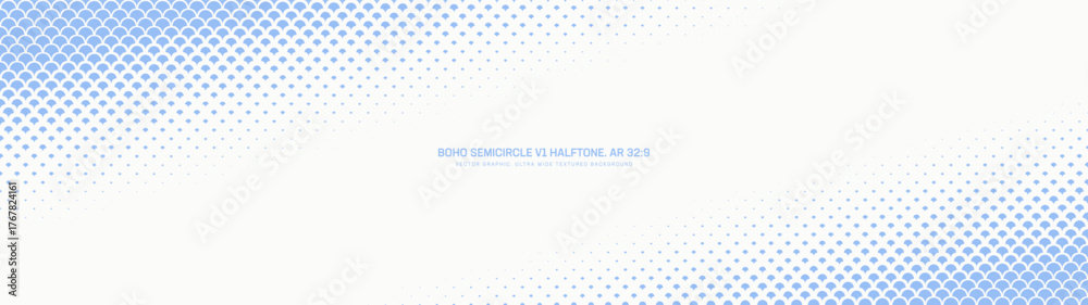 Semicircle scales halftone pattern diagonal frame ultra wide 32:9 aspect ratio white blue vector abstract background. Half tone oriental style panoramic ultrawide format fancy graphic abstraction #1767824161