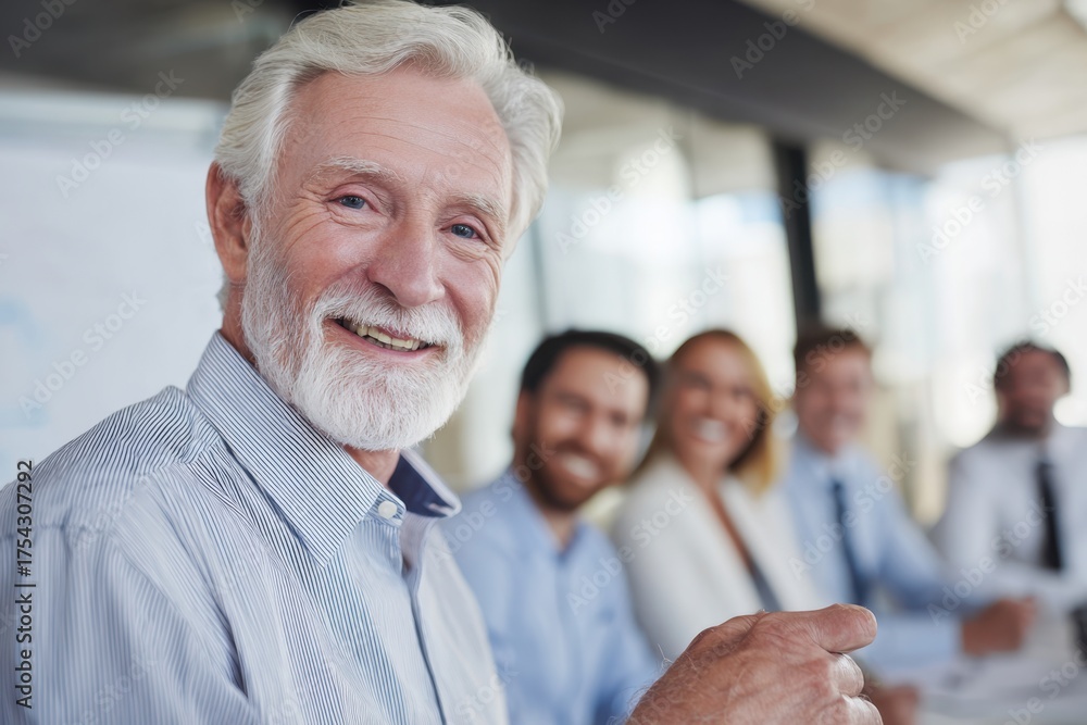 Senior Businessman Leading Team Meeting with Diverse Colleagues in Office Setting. #1754307292