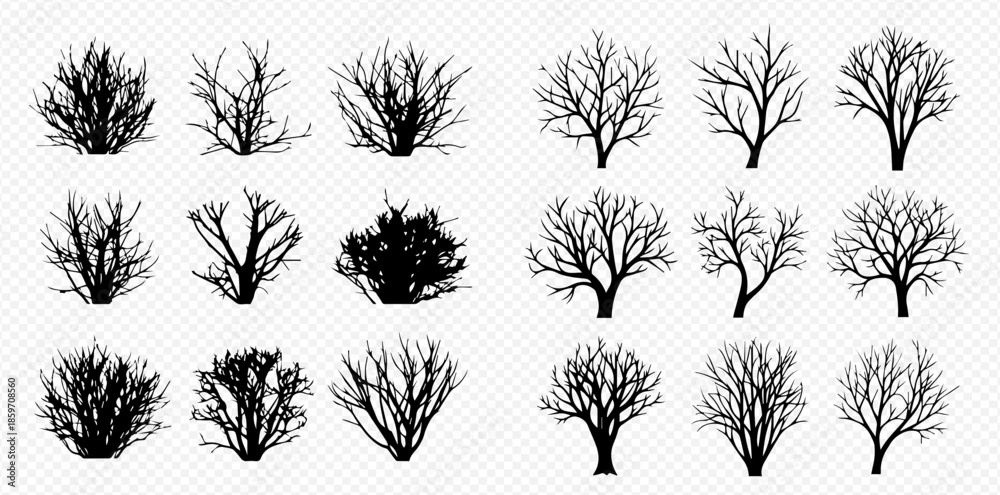 Set of bare trees and bushes silhouettes, black branches without leaves, natural elements for design. #1859708560