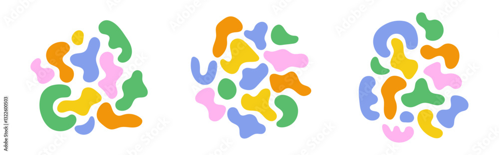 Set of cartoon fun kid patterns. Abstract multicolor amorphous elements, liquid amoeba forms. Colorful freeform blotches, organic shapes. Cute cool childish design for cover, poster, banner, wrapping. #1322600503