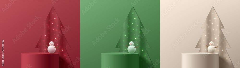 Set of 3D green, red, cream product podium with Christmas tree, Snowman background. Abstract composition in minimalist design. Studio display showroom stands pedestal, Fashion stage showcases mockup. #1775469788