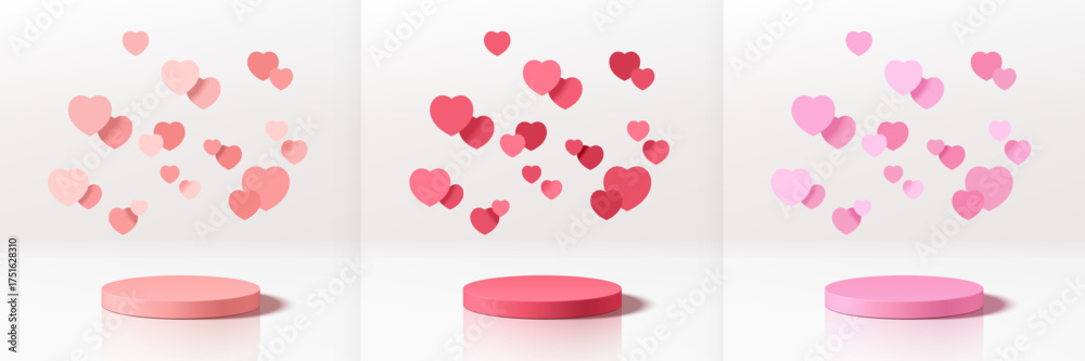 Set of 3D valentine day background pink, red, white product podium with paper cut heart shape. Abstract composition minimalist design. Studio display showroom stands pedestal, Fashion stage showcases. #1751628310